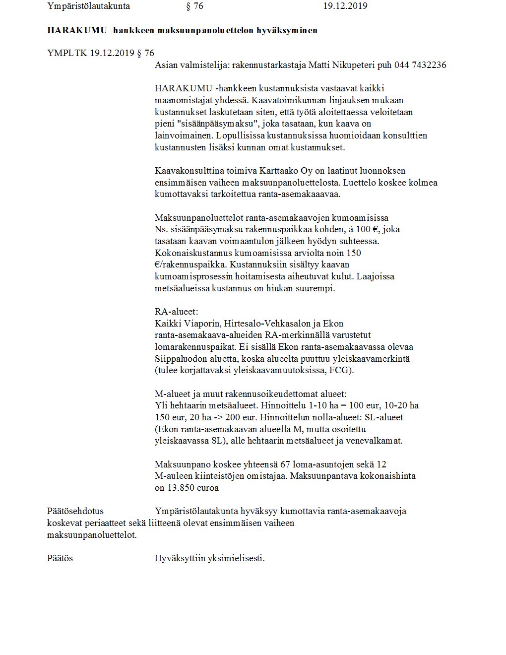Pöytäkirja 19.12.2019/Pykälä 76