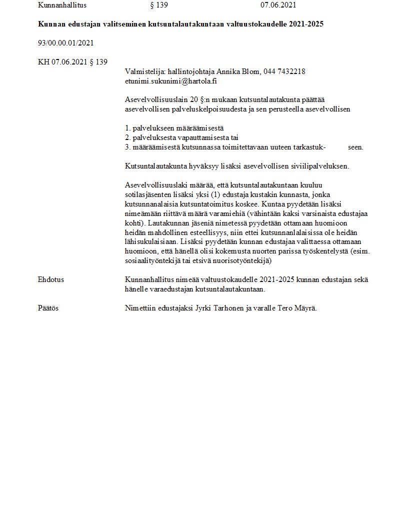Pöytäkirja 07.06.2021/Pykälä 139
