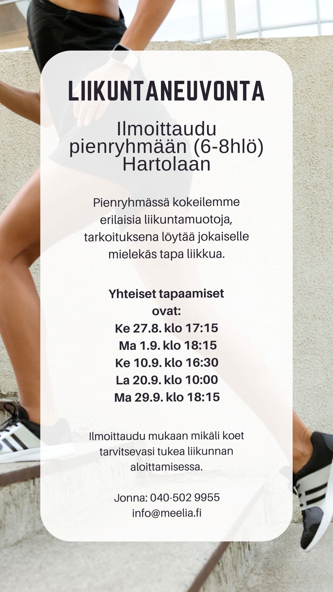 Liikuntaneuvoja Jonna Nieminen, p. 040 5029955, jonna@meelia.fi