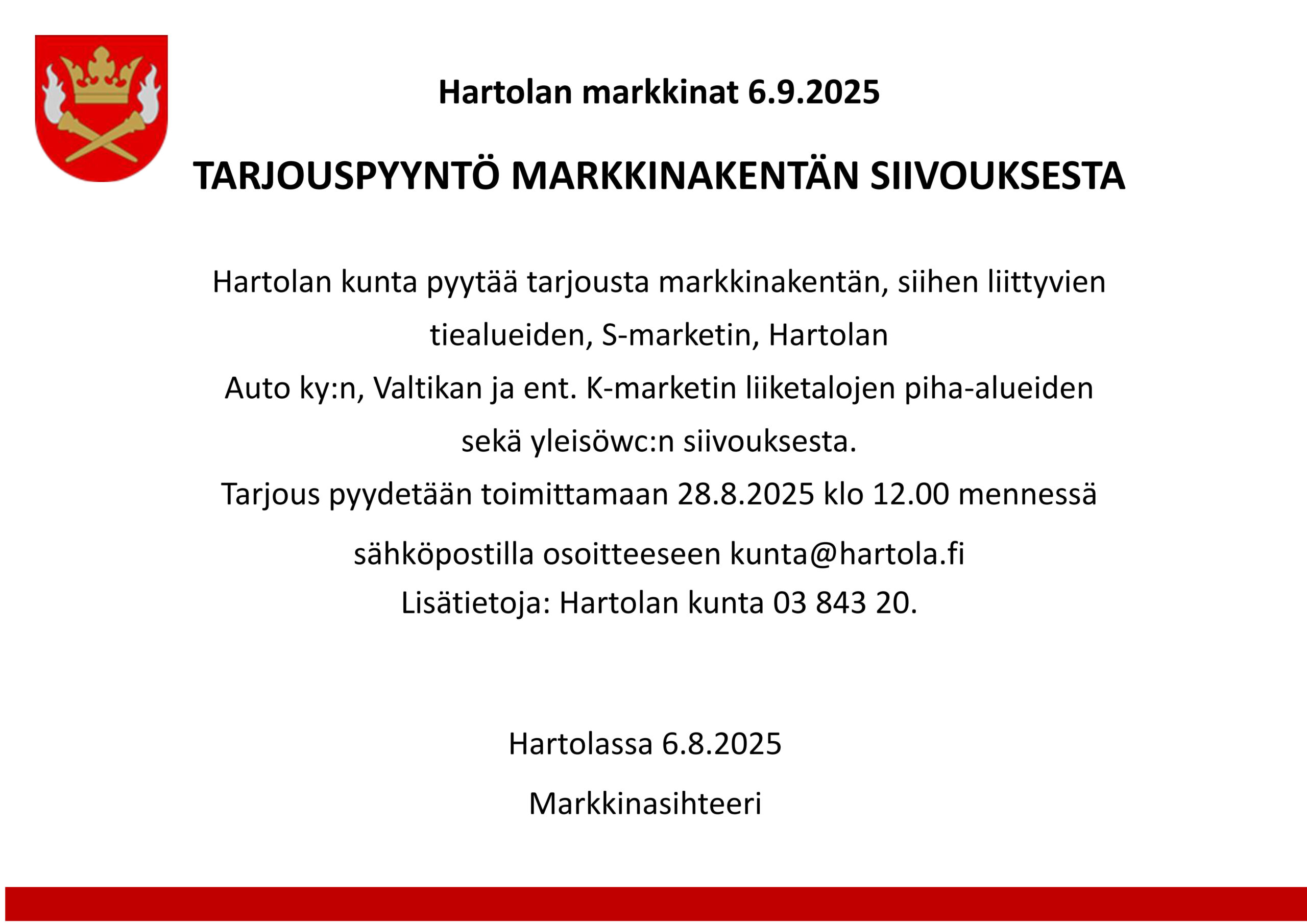 Hartolan kunta pyytää tarjousta markkinakentän, siihen liittyvien tiealueiden, S-marketin, Hartolan Auto ky:n, Valtikan ja ent. K-marketin liiketalojen piha-alueiden sekä yleisöwc:n siivouksesta.